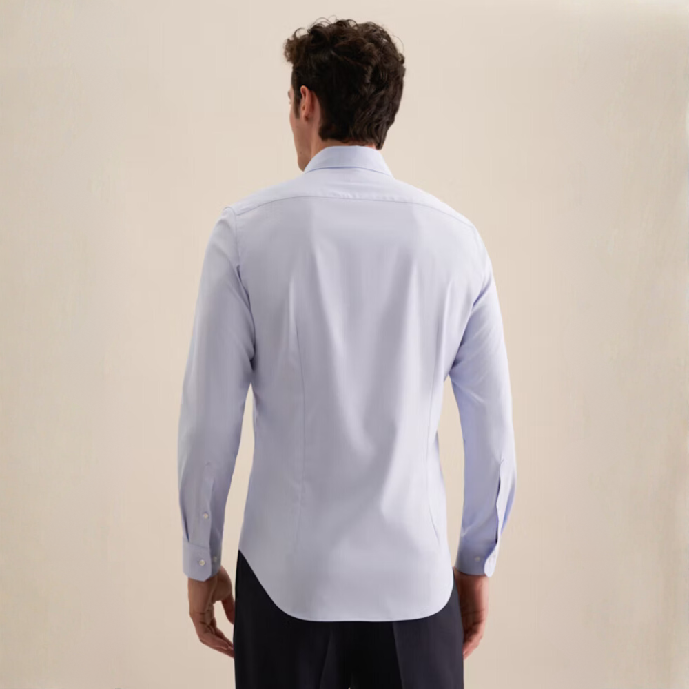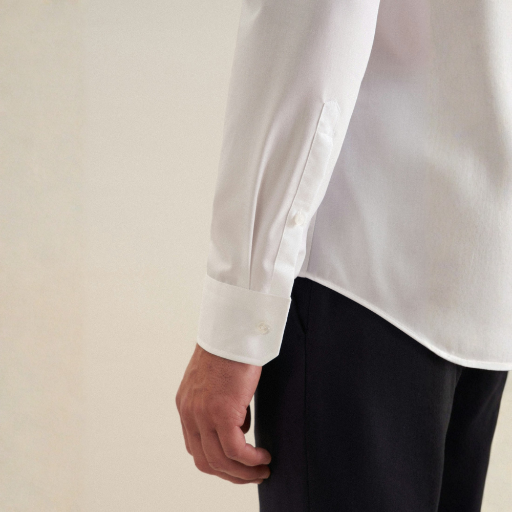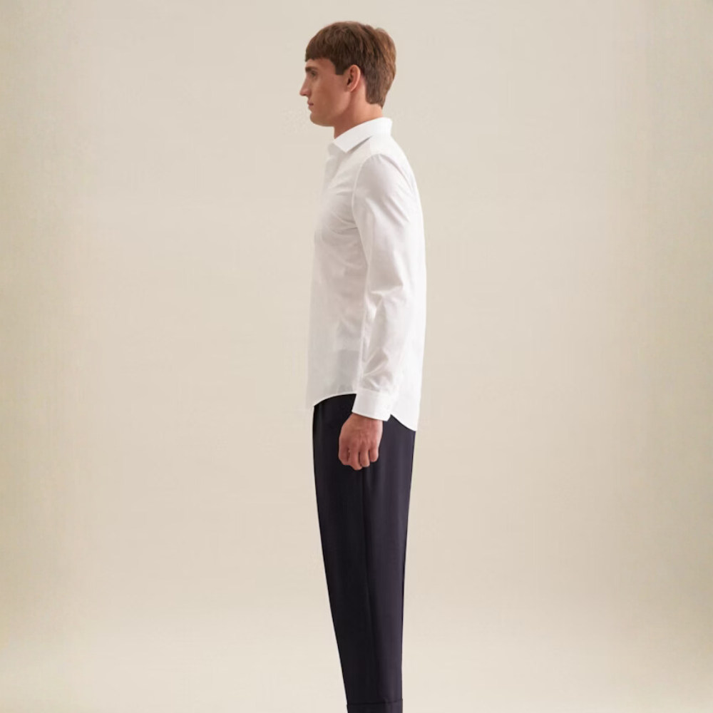 Grâce à l’élasthanne contenu dans le tissu, la chemise suit la forme naturelle du torse sans coller, ce qui met en avant la carrure tout en gardant une allure élégante.