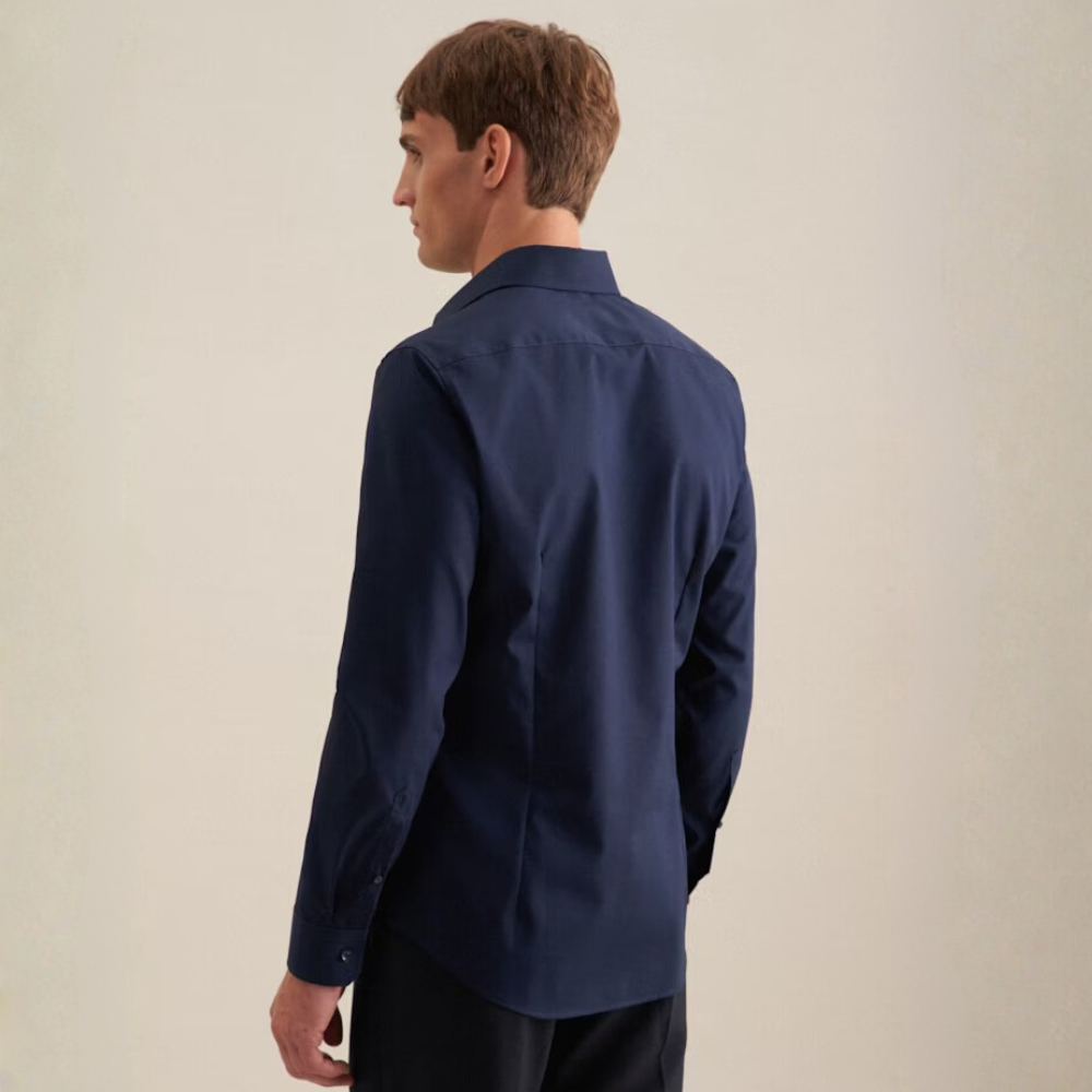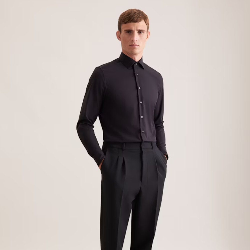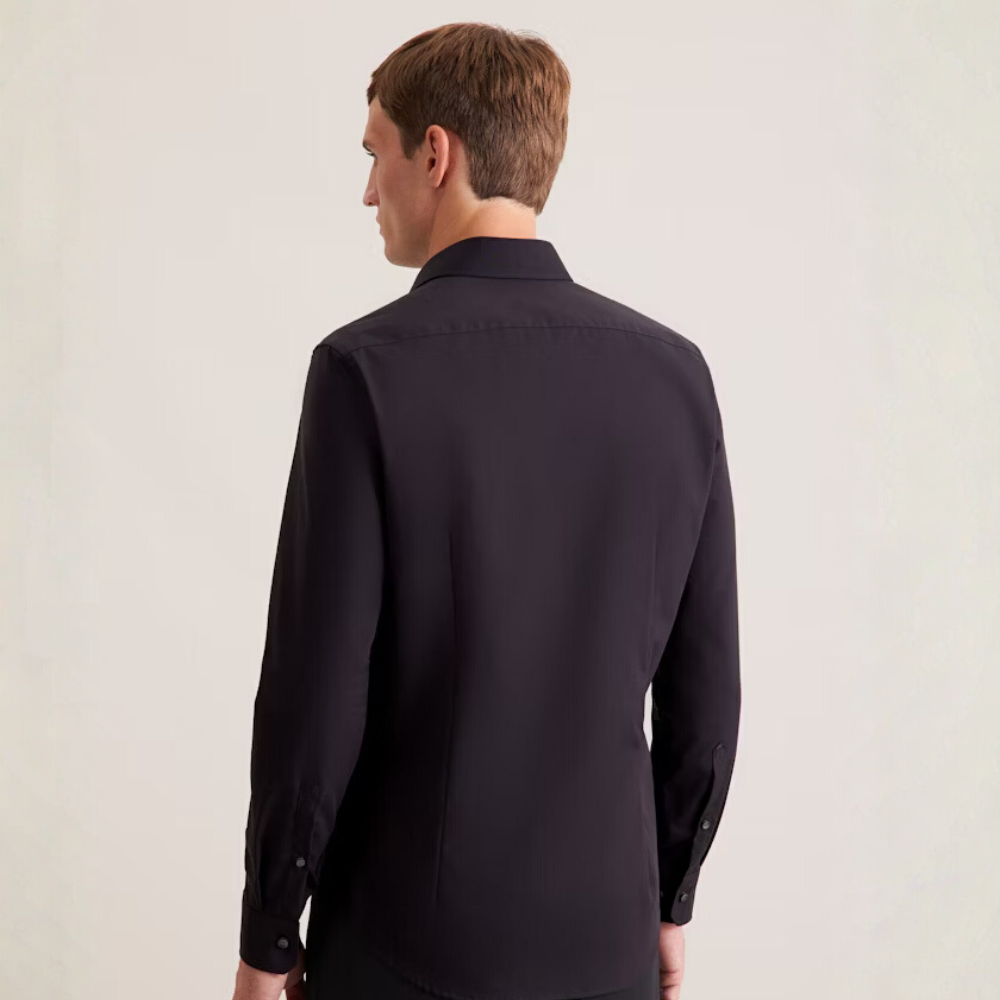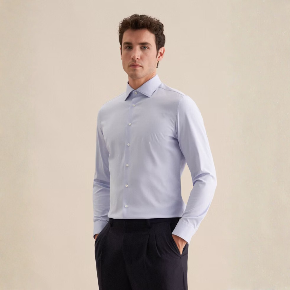 Grâce à l’élasthanne contenu dans le tissu, la chemise suit la forme naturelle du torse sans coller, ce qui met en avant la carrure tout en gardant une allure élégante.